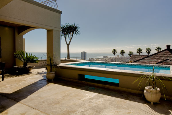 | Sophisticated contemporary villa overlooks the Atlantic Coast from all directions and captures the essence of living in Cape Town with its multiple open spaces and emphasis on the generous flow between exterior and interior complemented by magnificent glass sliding doors and windows. Enjoy a secure and tranquil environment, the graceful, restful aesthetic appeal of warm ambience that defines the floor surfaces, fittings, furniture and elegant lighting and benefit from the practical features that make this home ideal for comfortable luxurious living. Conveniently located, Fresnaye is just a short drive away from the Capes most beautiful beaches of endless white sands where the sea stretches forever and colourful Camps Bay, a lively seaside village with a variety of dining venues sure to accommodate all tastes. Sea Point, a pedestrianised shopping area with its rocky lined shore is only a five-minute drive down the road and Table Mountain and the V & A Waterfront is extremely close by. One of the many striking features of this villa is the unexpected view upon entering, from the plush serene front entrance; guests are welcomed by a clear view of the sea as far as the Table Bay lighthouse, Sea Point and the city centre just next-door. Solid beige painted graceful columns and a floating staircase accentuate the spacious, open plan character of this home and a wide passageway on the left and the right leads to the living areas with an exquisite blend of décor choices. To the left of the entrance, the living area exudes a warm and charming atmosphere with a varnished stone floor and luxurious beige curtains along glass sliding doors that open up on to a vast outdoor terrace, a large dark wood coffee table, an antique trunk and a great decorative antique grandfather clock that makes a bold statement in this modern setting and enjoy the ambience set by a large fireplace and the heat it generates while relaxing on a beige L-shaped long sofa with ethnic patterned scatter cushions. A relaxing mood is created in the dining area with a dark wood polished floor, a stylish, unpretentious square shaped table with eight textured wicker chairs, a matching smaller table, a long server and cabinets the table can also be easily turned into a 12-seater table for easy entertainment. A weightless, fully equipped stainless steel, minimalist designed kitchen is positioned behind the dining area where cooking is a pleasure with efficient granite working space, abundant patterned dark wood and frosted glass cabinetry, a serving/eating surface and an American style fridge and freezer. An adjoining laundry room features matching cupboards to the kitchen. The entire living area has glass sliding doors to the swimming pool and overlooks slender palms and the vast view. To the right of the villas entrance is a huge wood and glass door to a study with two custom-made wooden desks with silver handles, matching large cabinets, fitted wall shelves and two chairs that leads out to a clever tranquil bamboo-framed area with soft gentle plants, beautiful mosaic walling and a built in seat creating a lovely view from within the house. To the left of the study, through louver doors, is a cinema room with a brown suede sofa and ottomans, a low dark wood table and a fitted cabinet. The villas four beautiful, appealing bedrooms are en suite with comfortable beds and layered in luxurious linen to slip into. Bedroom one is positioned ahead of the study with glass sliding doors to the Meditative Garden, fitted beige wardrobes and drawers, a wall television, white linen and Moroccan bed wear. The bathroom has a big vanity area with a round washbasin, dark wooden shelving below, an oval shaped bathtub and a large open shower. Up a polished stone curved staircase, with spotlights along the bottom and chandeliers from the top with a glass skylight high above, are three large carpeted bedrooms en suite with fitted dark wood wardrobes and a television. Bedroom two has twin beds, wood and glass wall shelves and glass sliding doors that look over the little outdoor garden and the ocean ahead. Bedroom three has a Queen size wooden custom bed, a suede sofa, a dark wood desk, an armchair upholstered in red corduroy and dark wood wall cupboards and shelves. Bedroom four is massive with a King-size extra length bed with a light suede headboard, two sofa chairs with rests, a television cabinet, a window that faces Lions Head, glass sliding doors to another outdoor patio and a walk in closet with fitted dark wood wardrobes and shelves. All three bathrooms have large windows that either, face the Atlantic Ocean, Sea Point or the Table Bay Harbour. Bathrooms two and three are tiled with a separate glass shower curved bath and dark wood cupboards. Bathroom four has his and hers washbasins, a walk in shower that doubles as steam-room, with a mosaic seat and a big round Bathtub/Jacuzzi with views of the Ocean. The smooth polished outdoor terrace is the perfect place to relax when the seabirds wheel and weave through the early morning mist and when one stretches out on chairs to enjoy another sunset with an ice cold bottle of wine at the ready. Protected from the occasional unpredictable elements, sheltered patio area next to the pool is suitable for pre dinner drinks, outdoor dining and entertaining with its fair share of space around the house. It consists of dark brown weaved L-shaped sofa, two large square chairs, two box shaped tables, a dark wood table and four wicker chairs and a gas barbeque/braai. An archway, beige painted columns and an ornate wall mirror and huge oriental pots with cycads create a Moroccan aesthetic and add to the beautiful outdoor atmosphere. The rectangular shaped Salt Water Swimming Pool is framed in mosaic and extends to the edge of the balcony. This warm, charming home states pure contemporary sophistication and easy fine living where guests can relax, rejuvenate and be spoilt by nature. |