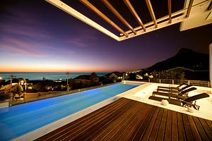 | This chic modern three floored villa features contemporary styling combined with spacious living and awesome sea views. The open plan kitchen/living /dining area leads directly to a generous terrace, making the space ideal for large scale entertaining. The ultra modern kitchen features all modern conveniences in a slick creative design. The five seater bar also doubles as a food preparation area, allowing you to view your sushi chef, up close and personal. There is also a ten seater dining table ensuring that there is always plenty of space for dining guests. The lounge/ living area is suitably luxurious with every major entertainment accessory, satellite TV, DVD, surround sound and Wi-FI access with direct access to the terrace and of course the legendry Camps Bay sea views The outside area which is accessed through a sliding door from the lounge has a Weber style gas fire; classy wicker patio furniture with a six seater table and four Hollywood style Sun Loungers The substantially sized infinity pool allows you to float leisurely while contemplating the magnificent ocean view. The master bedroom is a truly sumptuous affair offering spectacular ocean views from a private patio. The on suite bathroom is equally lavish. All the bedrooms are on suite and the guest bedrooms all have a TV and a DVD player. There is a top floor, connected and comprehensive office that easily satisfies all modern business requirements. The entire villa is set out in a quirky artistic style with imaginative touches giving the space a unique personality. There is also a fashionable and fresh guest cottage on the property with an on suite, compact lounge with TV, and DVD, mini-kitchen, queen sized bed and own separate entrance from the street. Perfect for younger visitors or other guests who may require a little privacy. It is just a short walk to the Camps Bay beachfront with its world renowned beach, celebrated restaurants and happening clubs and bars. The Cape Town CBD is just a quick ten minute drive way |